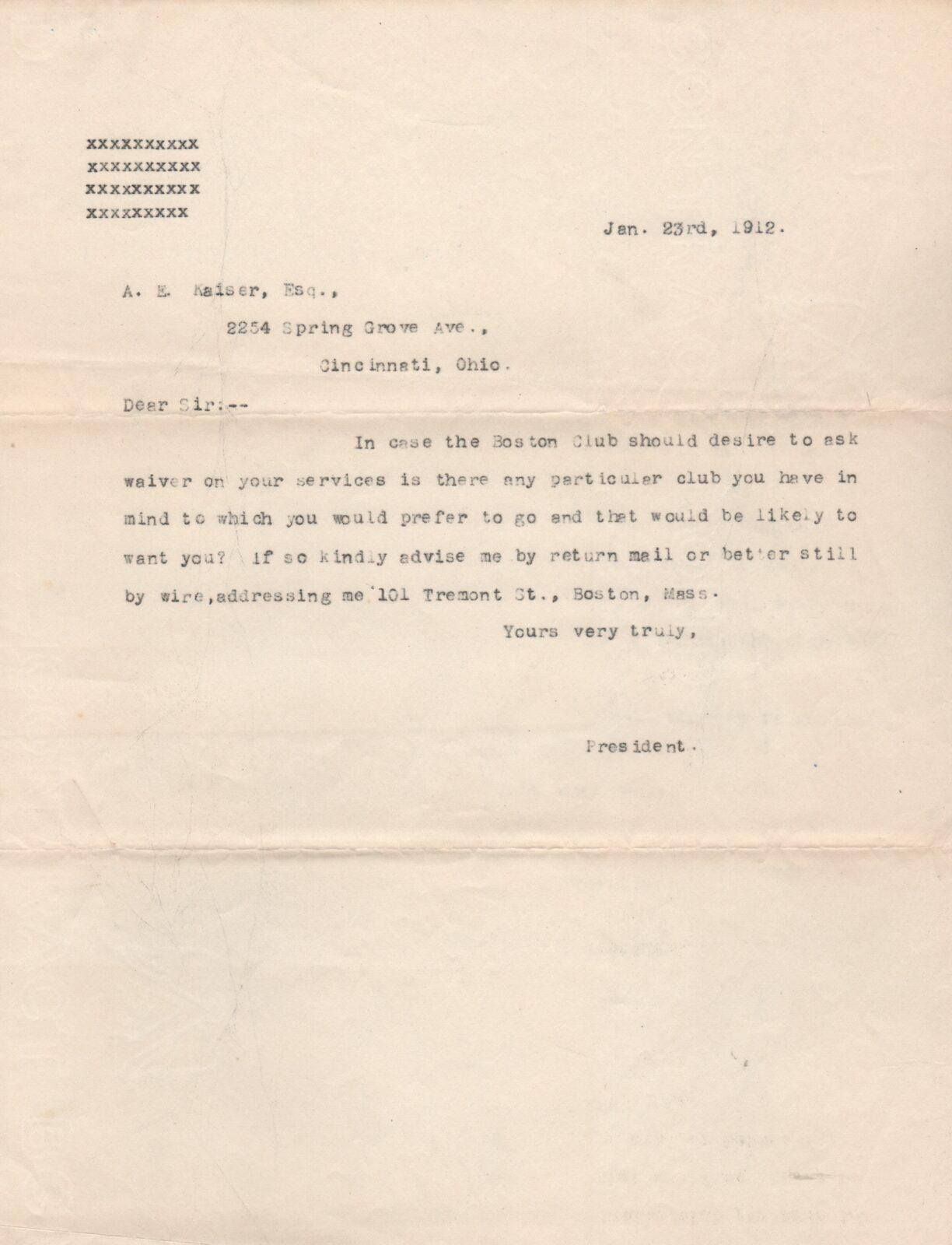 After receiving word from Al Kaiser that the contract was unsatisfactory, John Montgomery Ward played hardball. Shown here is a file copy of Ward’s harsh response to his outfielder. It’s dated January 23, 1912. Ward writes, “In case the Boston club should ask waiver on your service