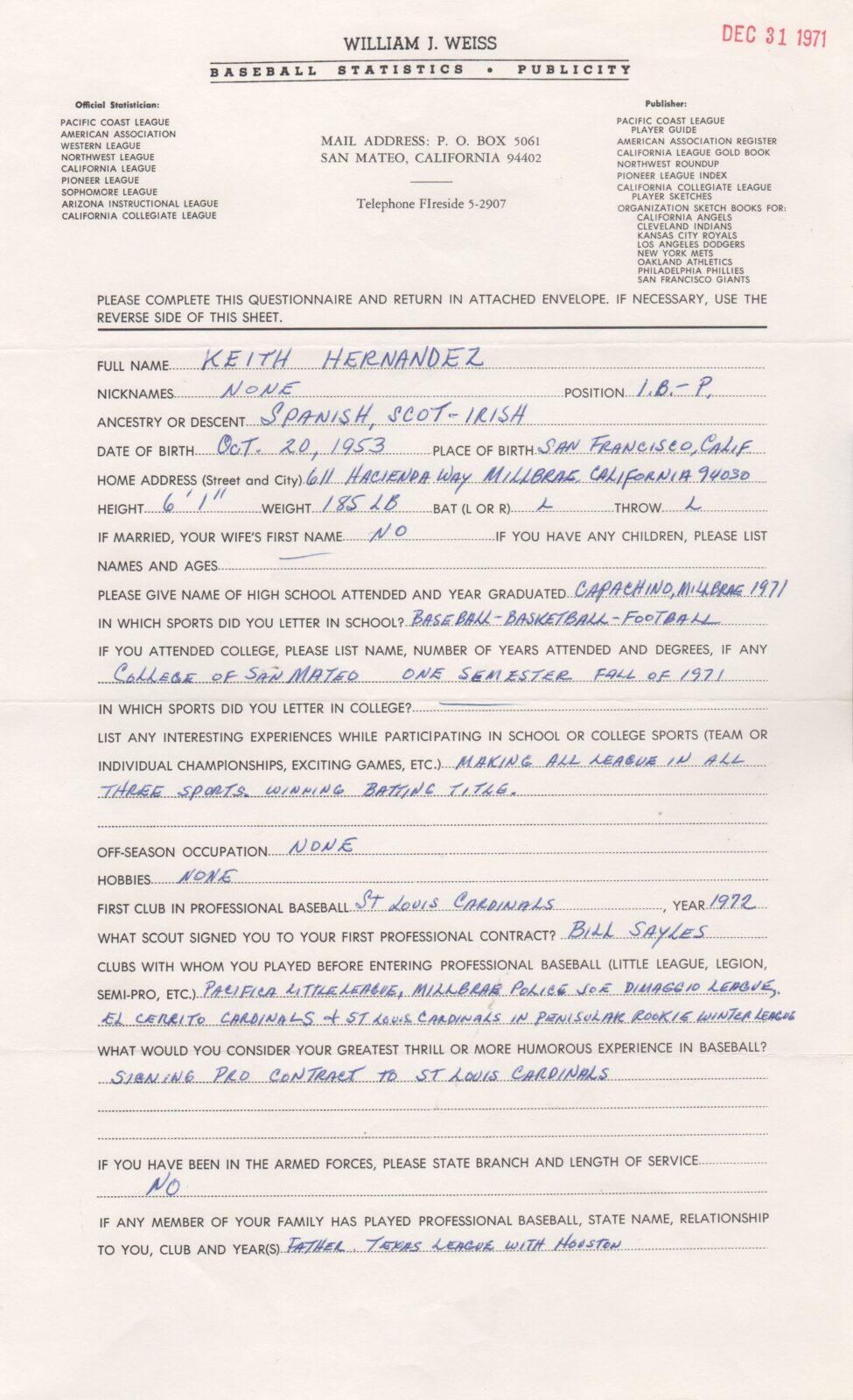 As an 18-year old, Hernandez filled out the league’s official publicity questionnaire shown above. Items predating a player’s MLB debut are rare; this one comes from before the Gold Glover’s minor league professional debut.