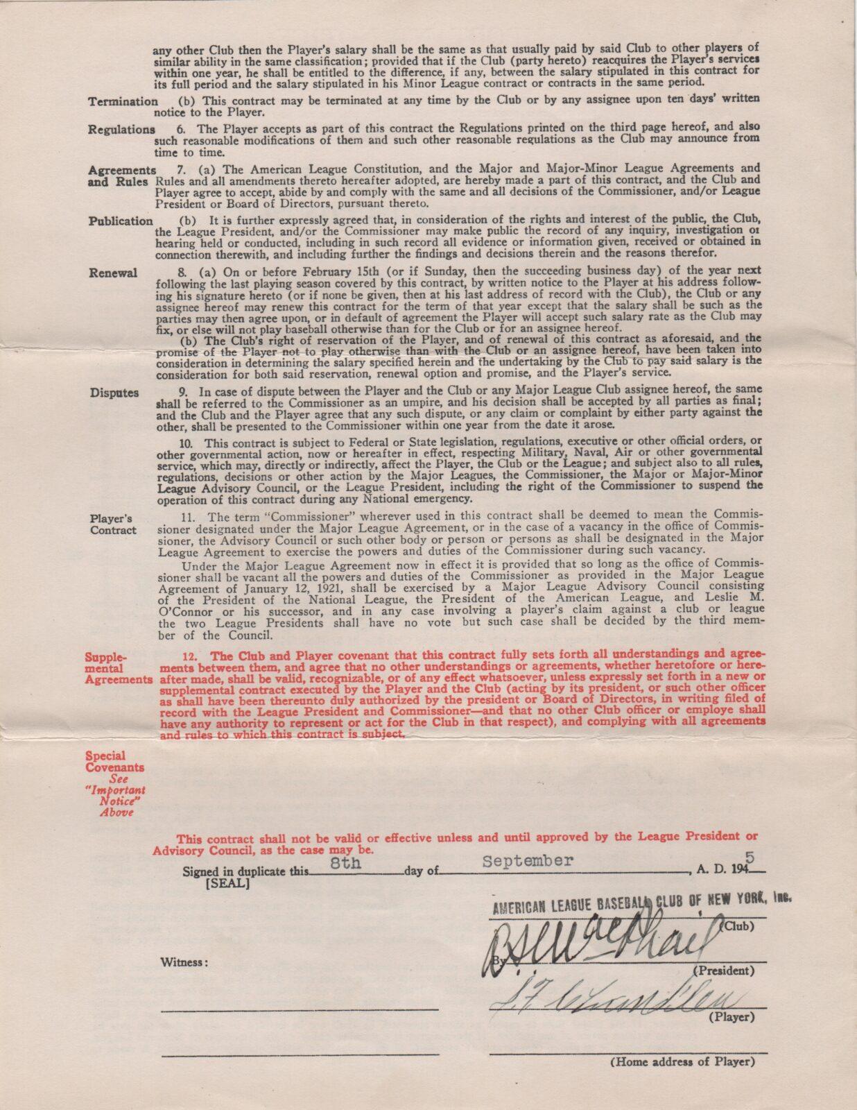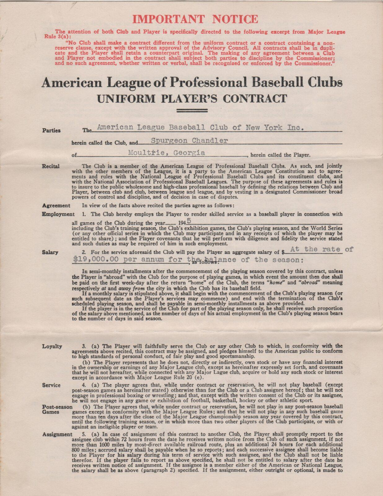 Just two seasons removed from his 1943 Most Valuable Player season, Spud Chandler signed this contract with the New York Yankees. An All Star in four of his eleven years, Chandler enlisted into the US Army after just one start in 1944. After spending nearly two years away from the game, Chandler ret