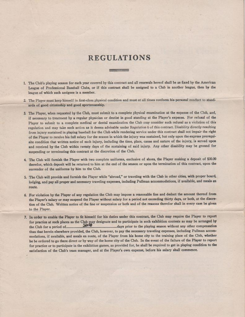 "Regulations" page of the 1945 Spud Chandler player's contract