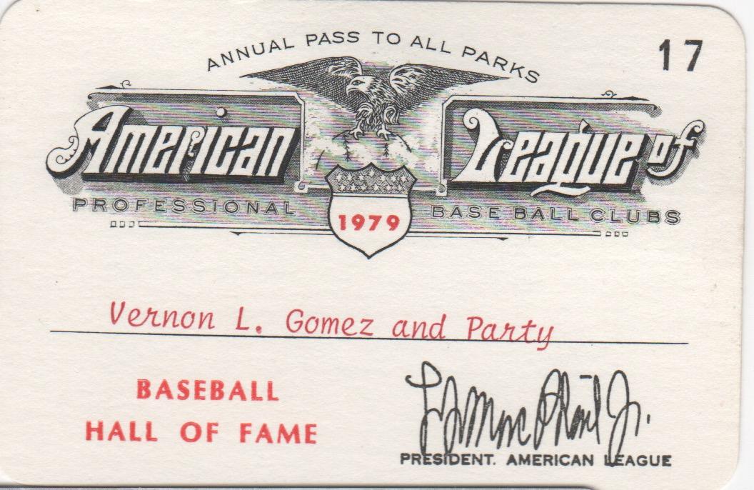 Imagine having free admission to every American League game for you and your guests. Lefty Gomez received this pass granting him just that in 1979 as a Hall of Fame member. A lifelong American Leaguer, Gomez helped the Junior Circuit win five World Series. He excelled in postseason play, going 6-0 w