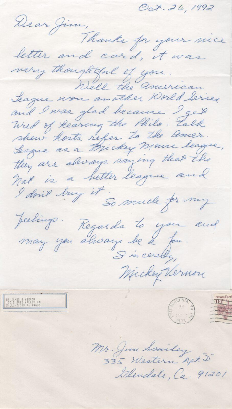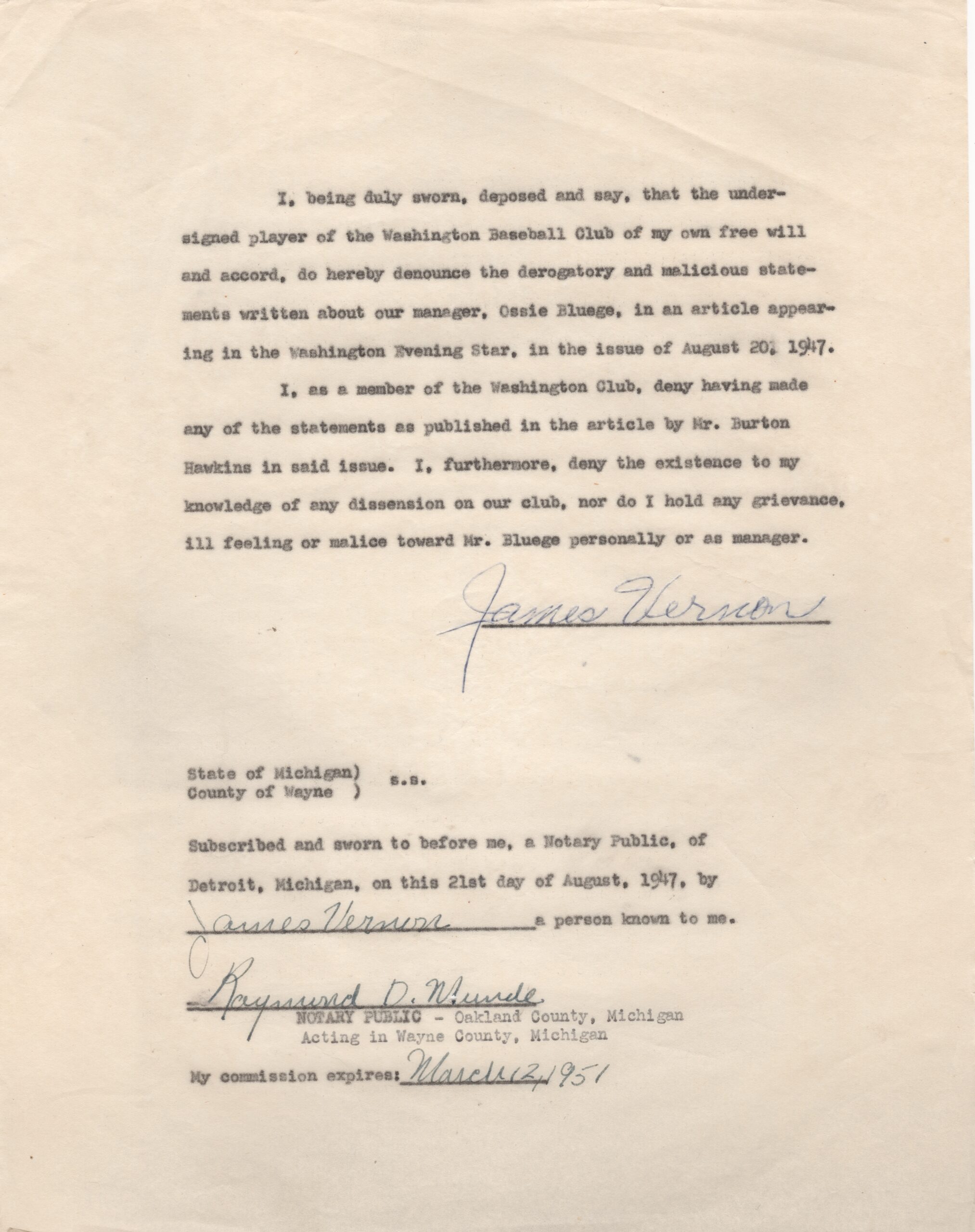 Shown above is an affidavit signed by Mickey Vernon with his legal first name of James. The notarized document is dated August 20, 1947, the day of the Senators 11th straight loss. In it Vernon denounces the “derogatory and malicious statements written about our manager…”.