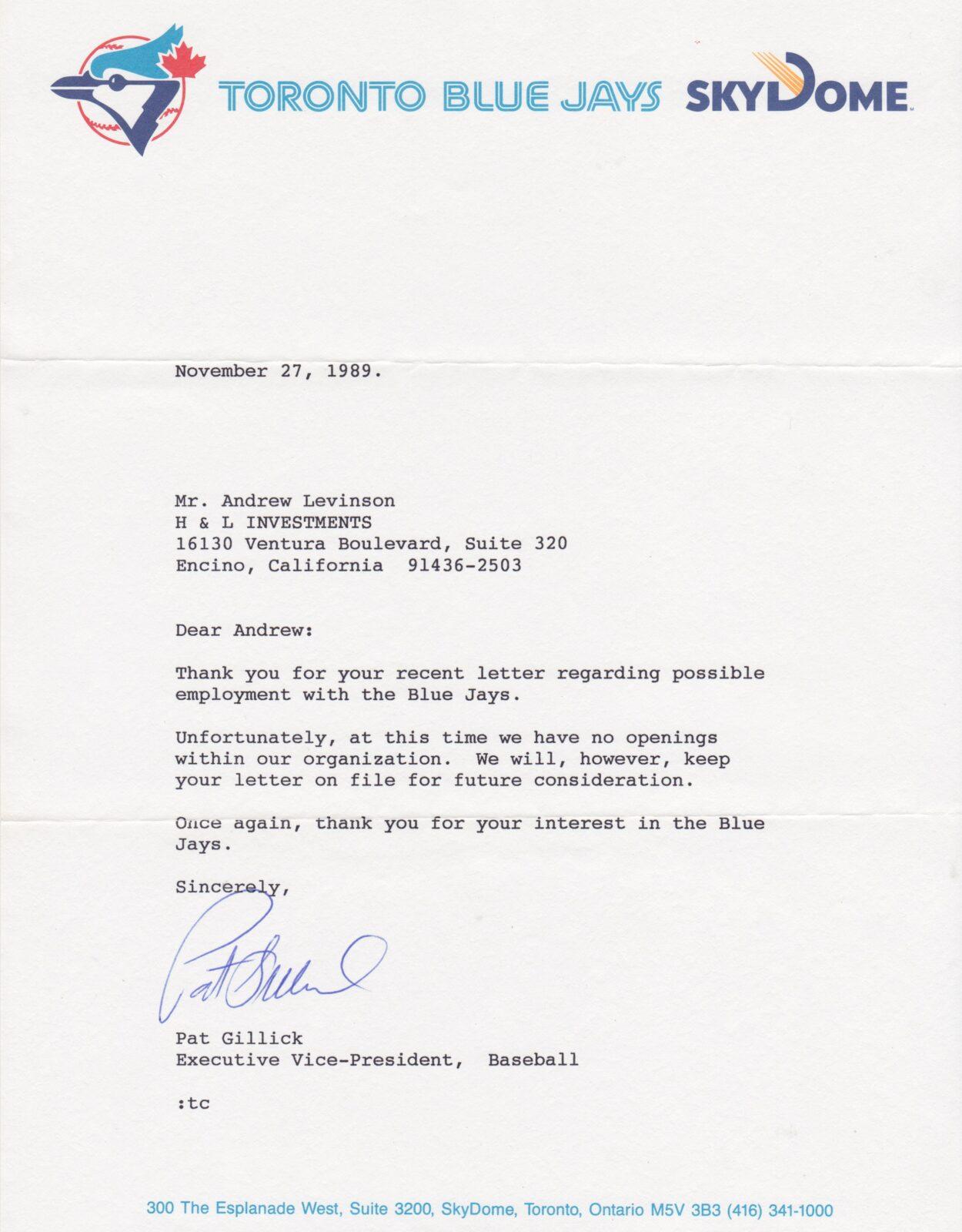 Shown here is a letter from the 1989 season in which Gillick politely informs a man that there are no employment opportunities.