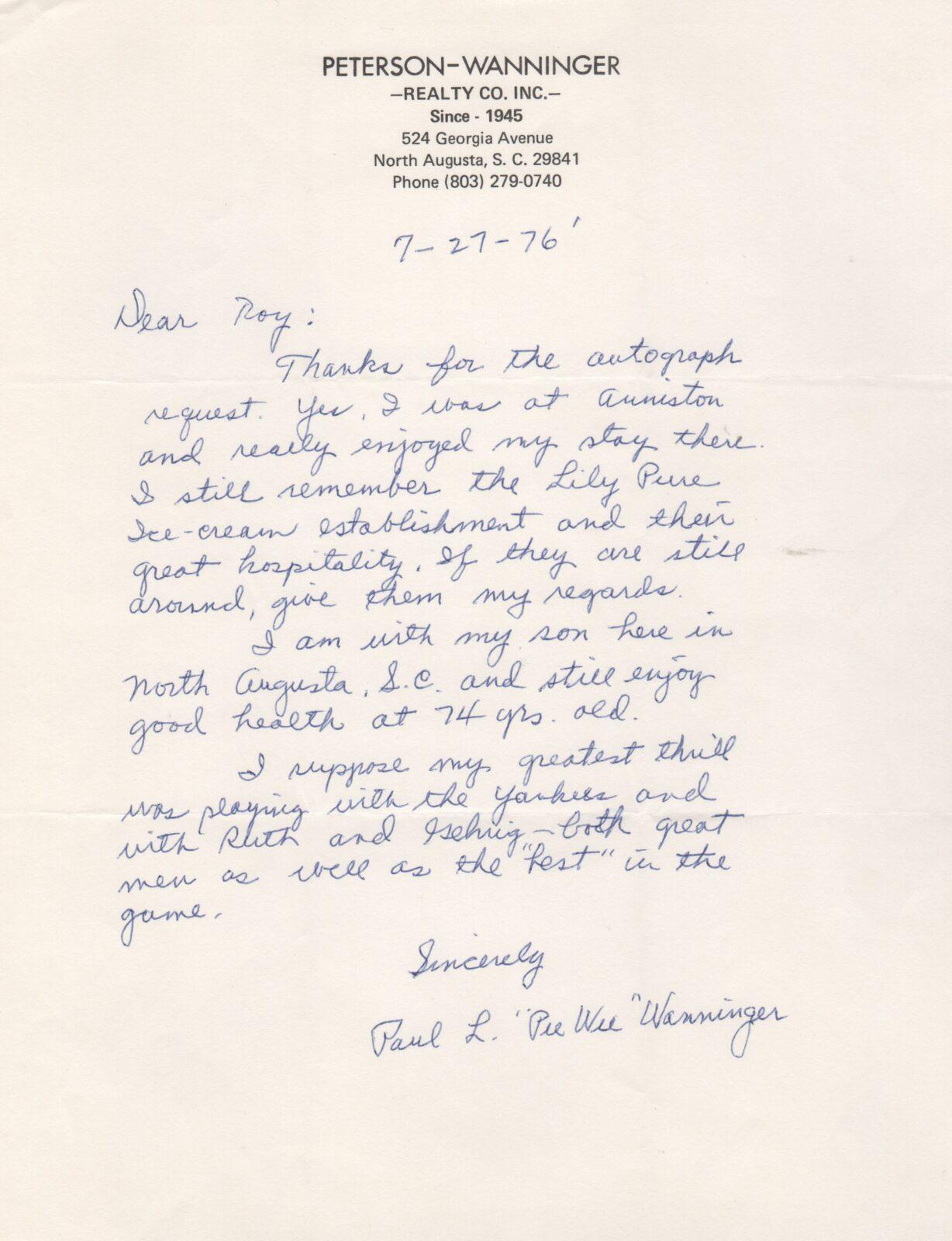 Pee Wee Wanninger was 73 years old when he penned this letter to an autograph collector on 7/27/1976. Wanninger thanks the collector and writes about his current life before closing the letter, “I suppose my greatest thrill was playing with the Yankees and with Ruth and Gehrig – both gr