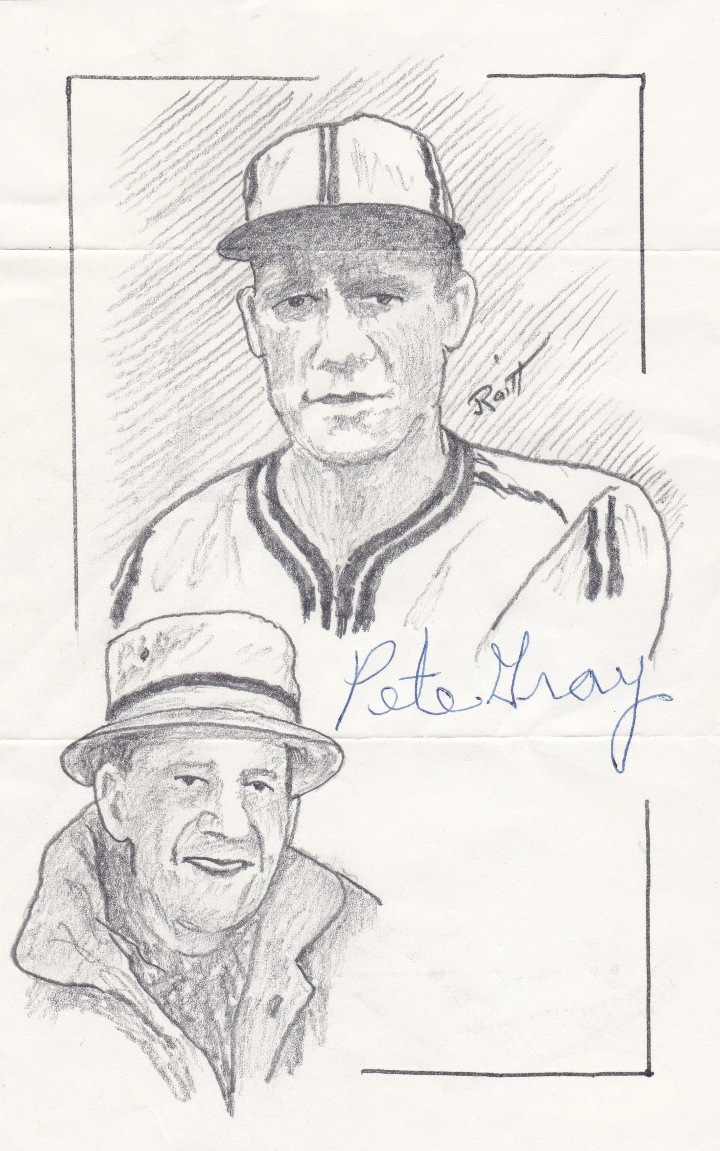 In the collection is this hand-drawn sketch of Pete Gray. The one-armed outfielder added his autograph across the drawing.