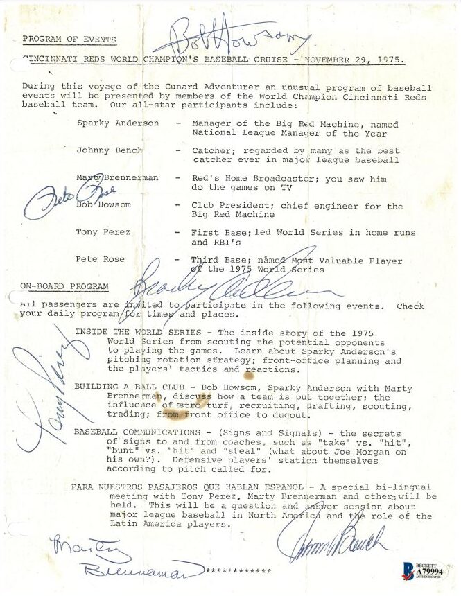 Shown here is the baseball itinerary from that cruise. It is signed by all seven Reds and authenticated by Beckett. The itinerary describes baseball’s all-time hits leader, “Pete Rose – Third Base; named Most Valuable Player of the 1975 World Series”.