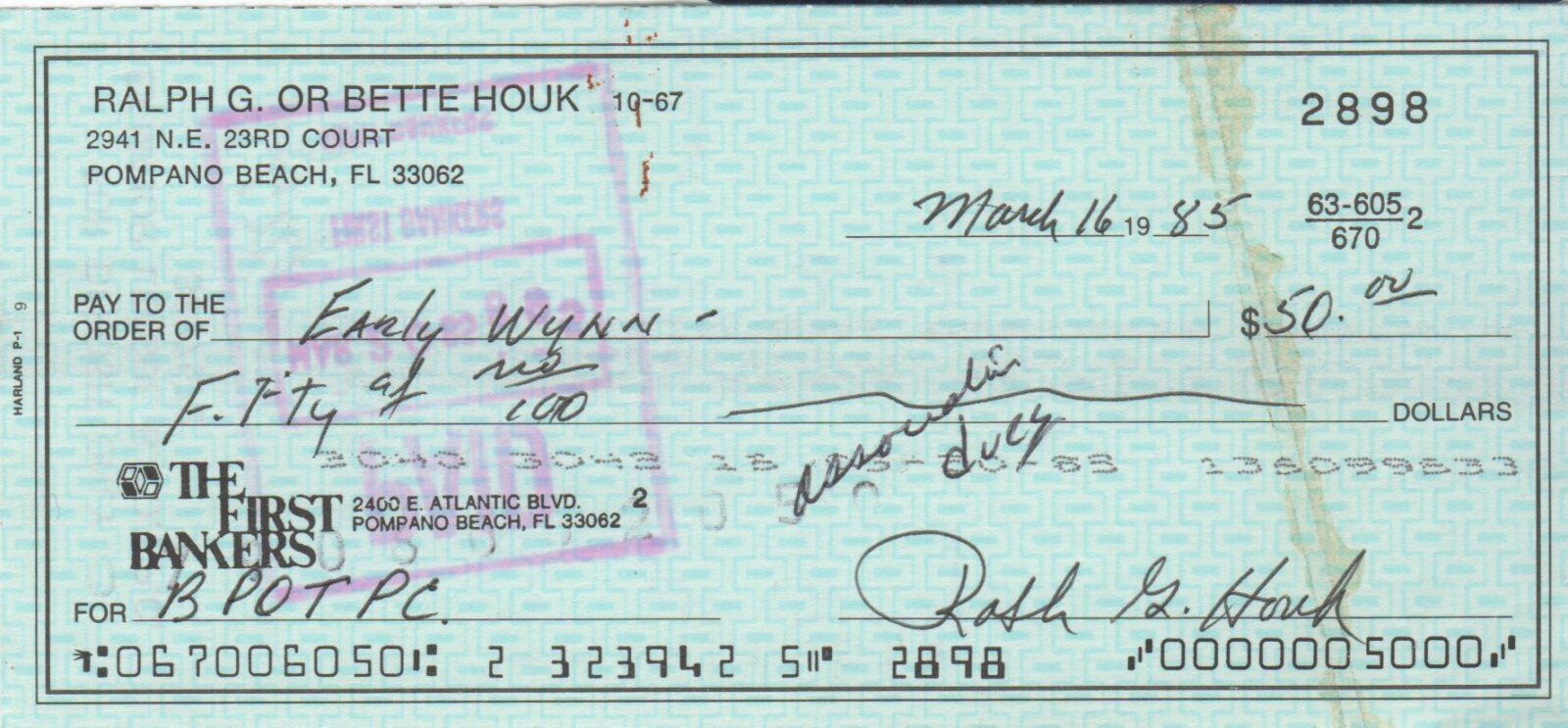 Ralph Houk signed this check for $50 to Hall of Fame pitcher Early Wynn who has endorsed it on the reverse. Signed on March 16, 1985 just six months after Houk’s last managerial job with the Red Sox, the check provides the signatures of two men important to baseball history. In his 20 years as