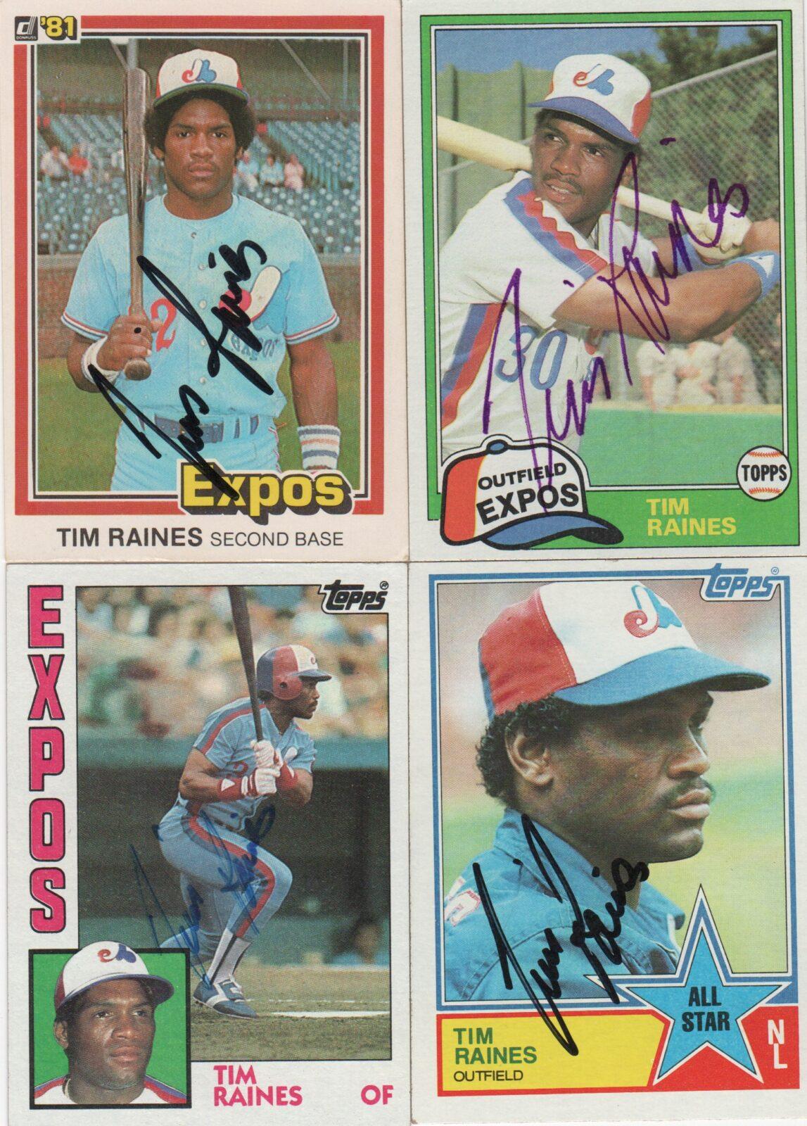 Shown here are four Tim Raines autographed baseball cards from the early 1980s.