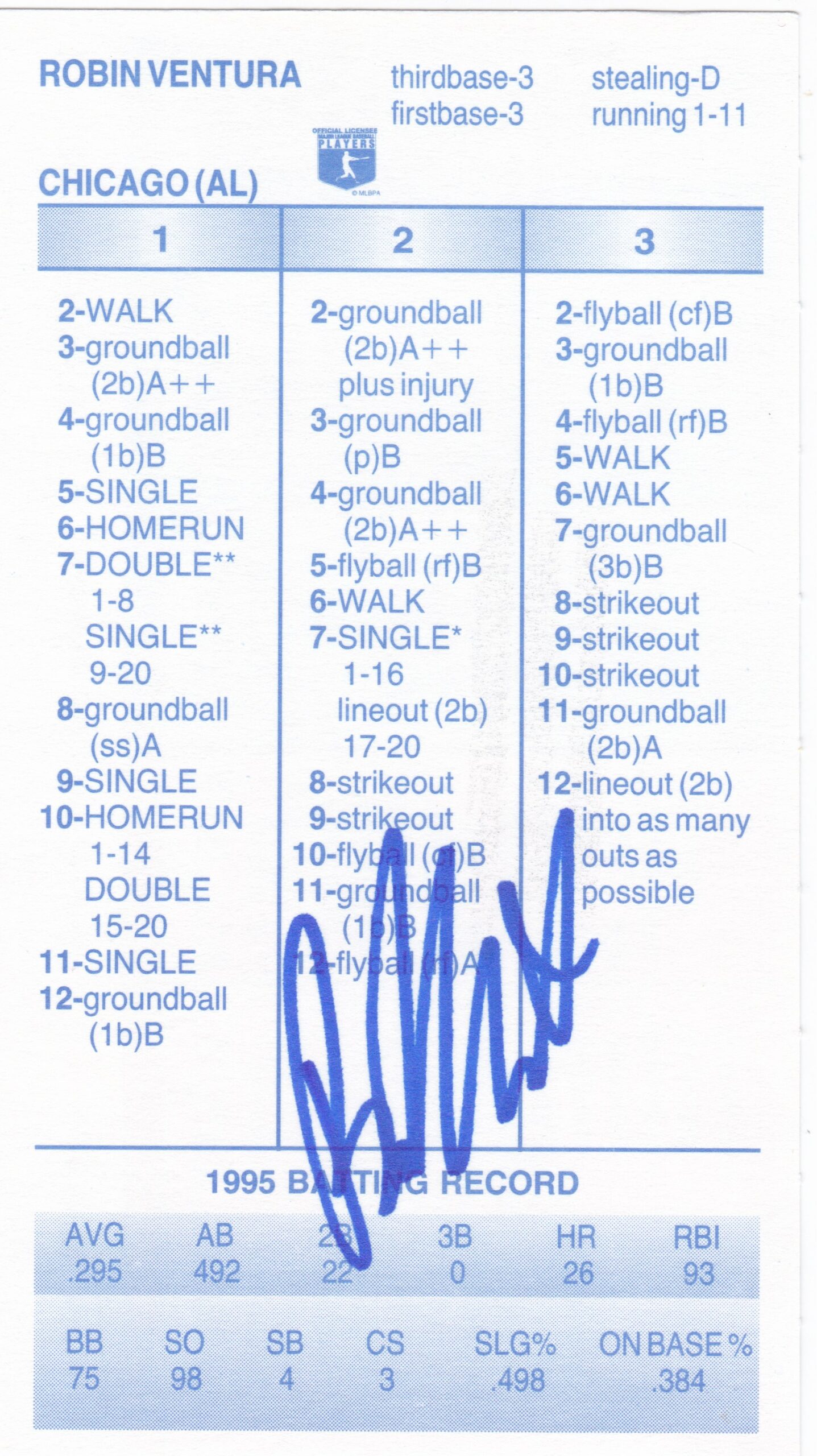 In the collection is this Robin Ventura autographed Strat-O-Matic card from 1995. That season he posted career highs in both on-base percentage, and OPS+ with the White Sox.