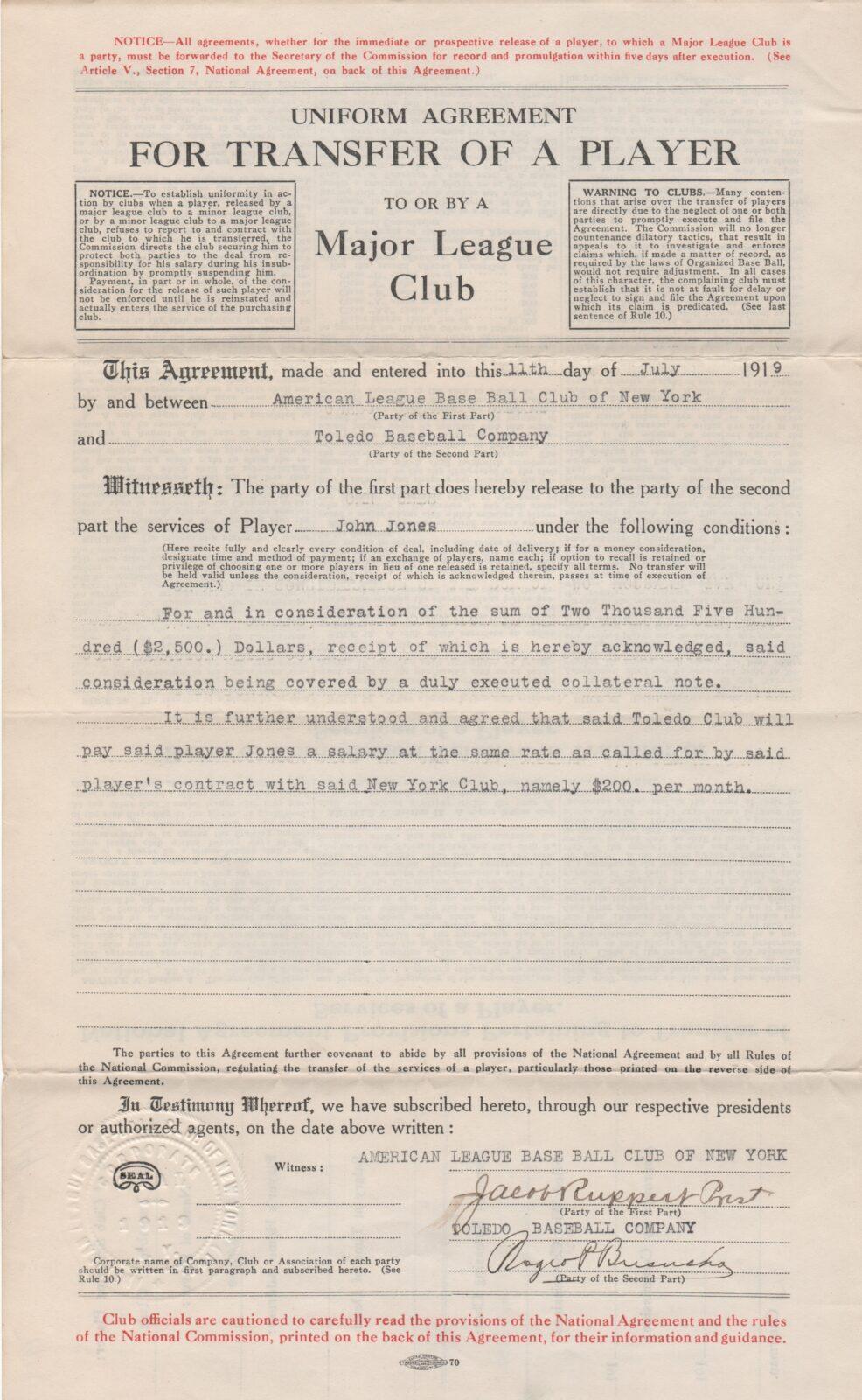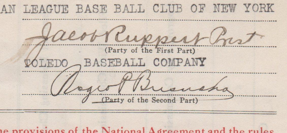 A nice closeup of the signatures of Roger Bresnahan and Jacob Ruppert is shown here. Christy Mathewson’s longtime battery mate, Bresnahan amassed 1,252 career hits and a  .279 lifetime average. He also served as player/manager for the St. Louis Cardinals from 1909-1912 and for the Chicago Cub