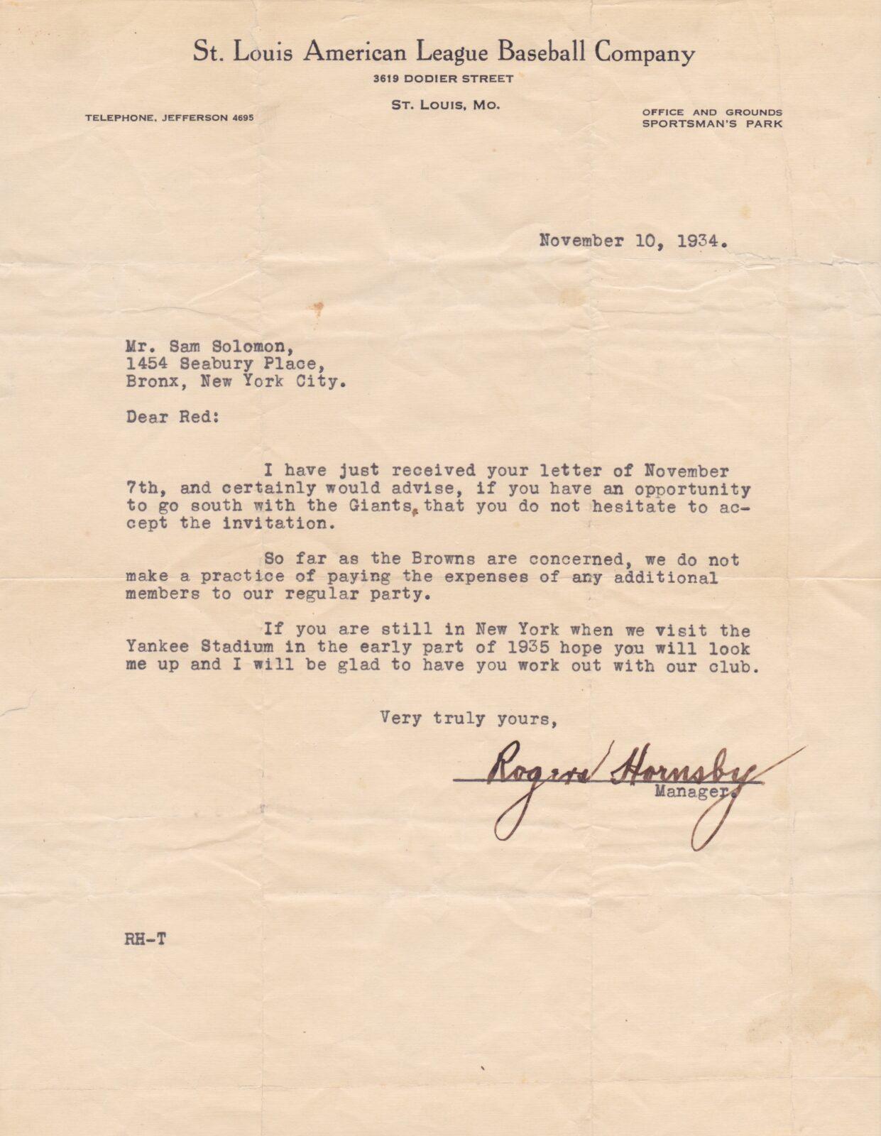 The above letter is written to Solomon in late 1934. As manager of the St. Louis Browns, Hornsby tells Red, “if you have the opportunity to go south with the Giants…do not hesitate to accept the invitation”. Rajah goes on to that when the Browns, “visit Yankee Stadium in the early part of 1935 hope you will look me up and I will be glad to have you work out with our club.”