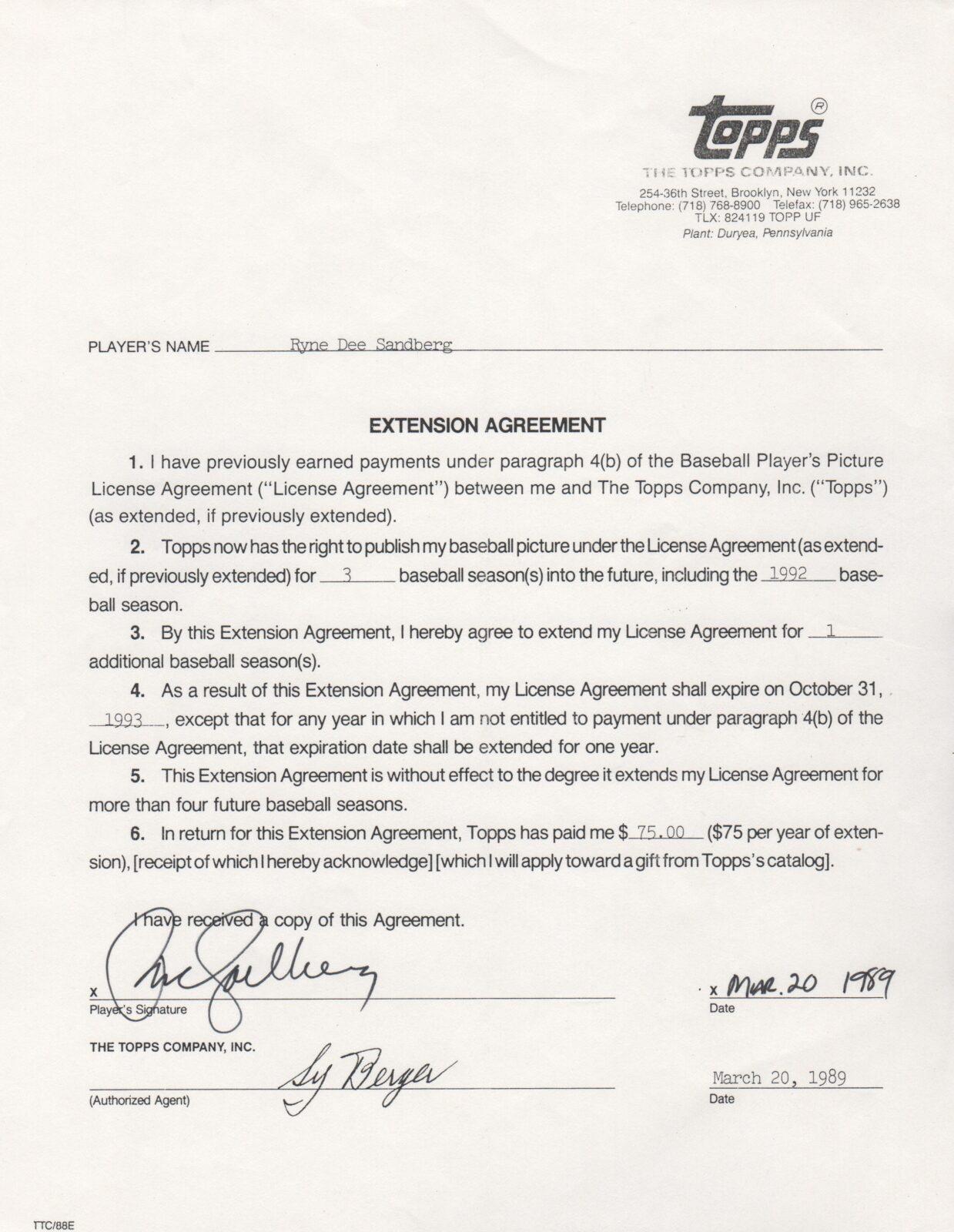 In the collection is a signed Topps contract dated March 20, 1989. The deal calls for Ryno to appear on Topps cards through the 1992 season.