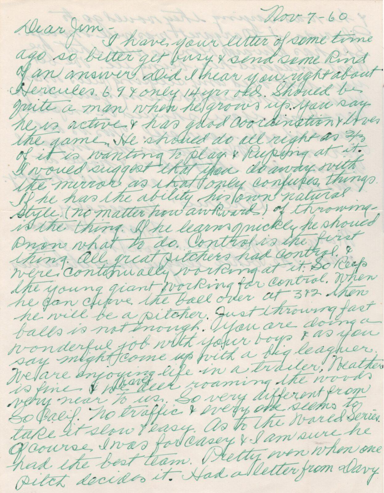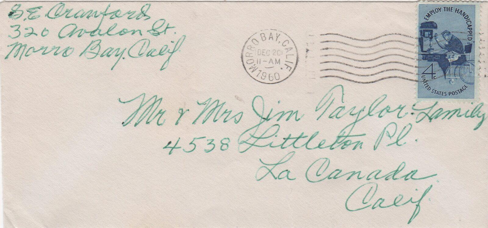 Shown here is an envelope addressed to Jim Taylor of La Canada, California with a 1960 postmark. Sam Crawford has neatly signed his name in the return address portion.