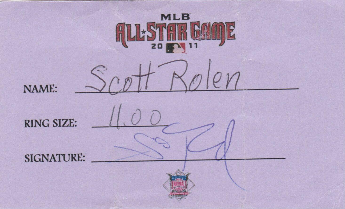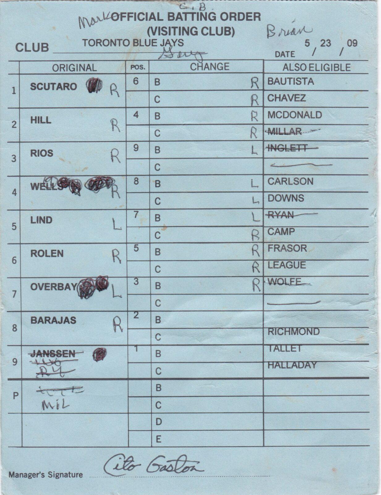Scott Rolen played in 2,038 big league games, all but 203 in the National League. His AL contests came in 2008 and 2009 with the Toronto Blue Jays. While in the AL East Rolen hit .288 with 19 homers and 93 runs batted in. In the collection is this game-used lineup card signed by Jays manager Cito Ga
