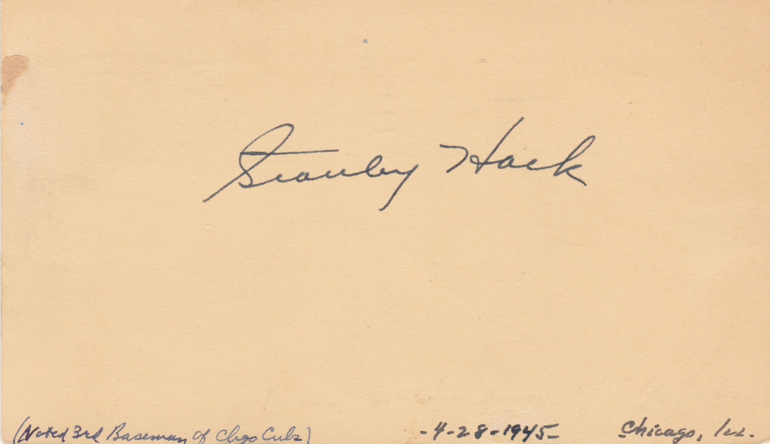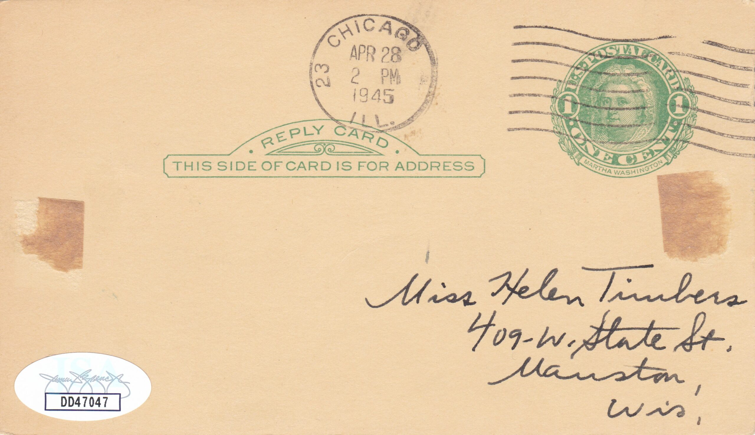 Shown here is the reverse of the Stan Hack autographed government postcard. Notice the postmark of April 28, 1945 from Chicago, Illinois. That day Hack’s Cubs played host to manager Frankie Frisch‘s Pittsburgh Pirates. Just 5,708 fans witnessed the Cubs’ 6-0 win. Chicago pitcher Hank Wyse had a no-hitter through 8 1/3 before