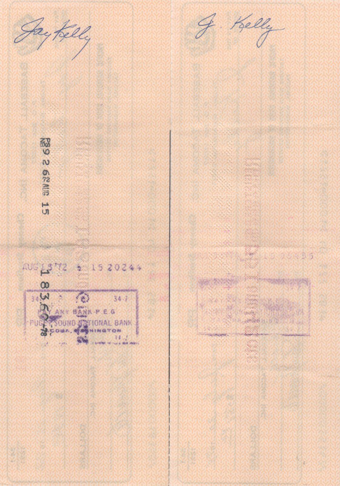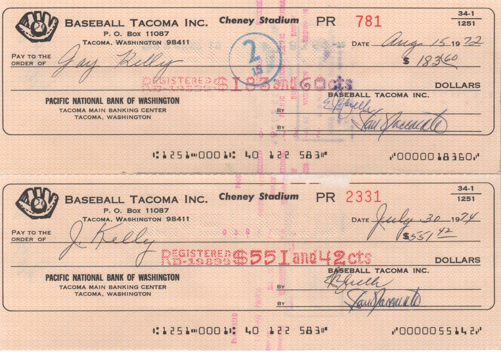 On the reserve of each check is the unusual Kelly signature bearing his legal first name, “Jay”. Kelly managed the Minnesota team for sixteen seasons, winning the World Series in both 1987 and 1991. There have only been 24 men have managed more than one World Series title and most are in