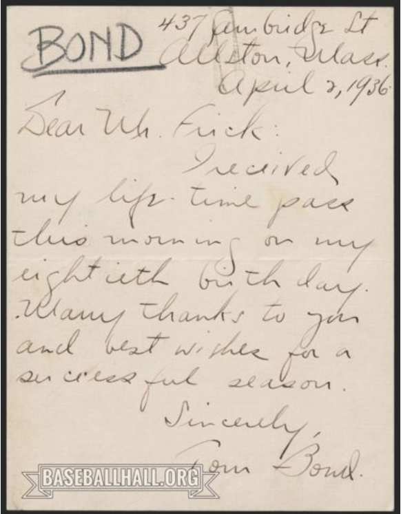In the Hall's collection is this letter written by Tommy Bond thanking Ford Frick for his lifetime pass