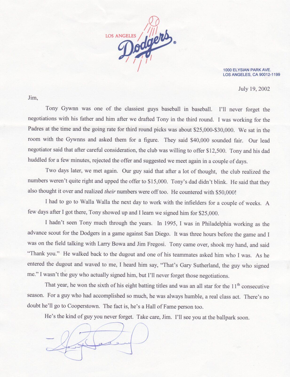 It’s a long road from college to the Major Leagues. Tony Gwynn’s started down that path after the Padres drafted him in the 3rd round of the 1981 draft. Present the whole way was San Diego scout Gary Sutherland. In this letter “Sudsy” writes about contentious contract negoti