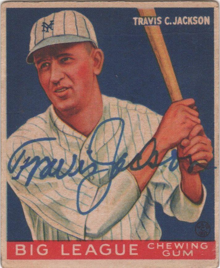 Shown here is Travis Jackson’s baseball card from the iconic 1933 Goudey Gum Company. Jackson has boldly signed the center of the card.