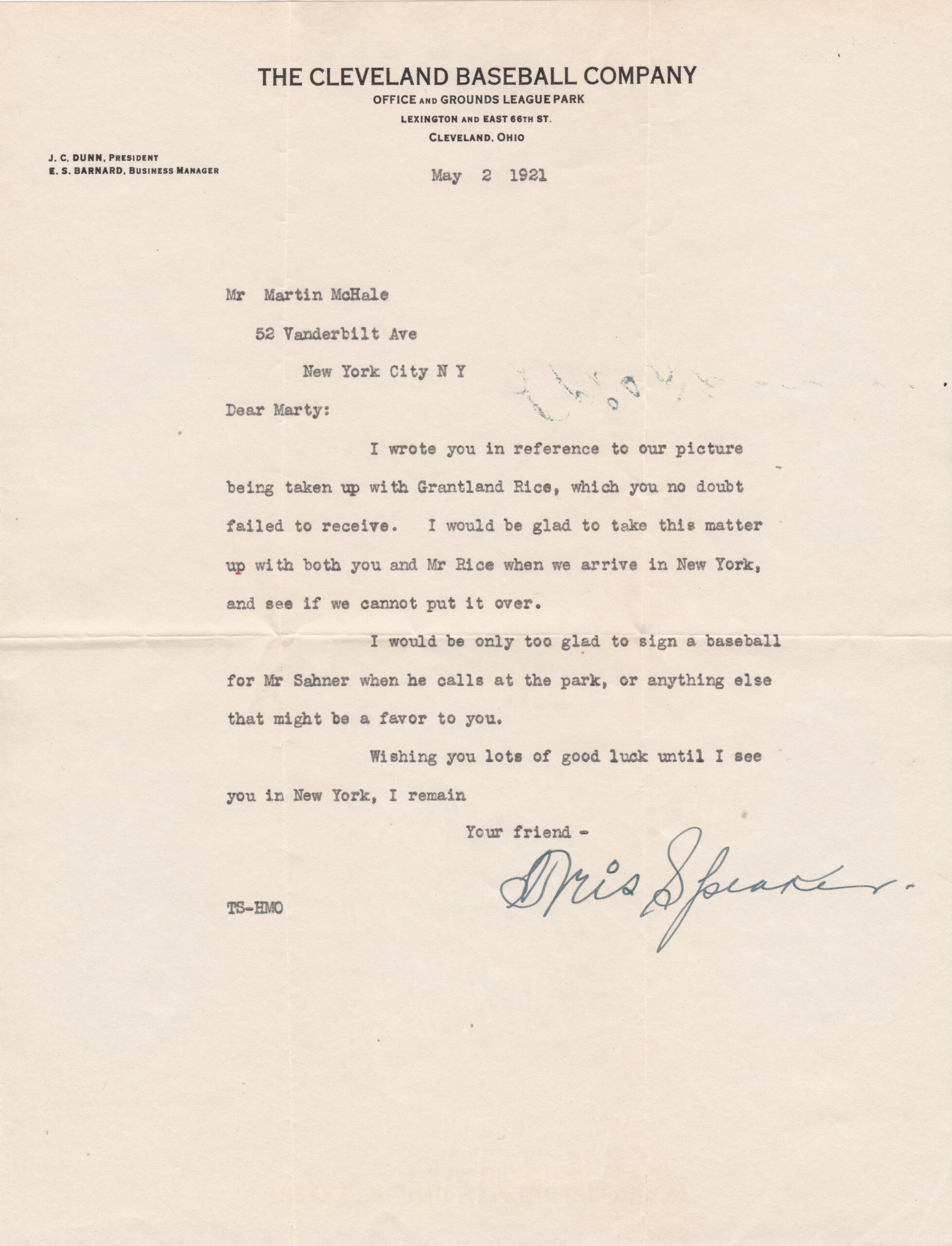 In the collection is this letter – one page of a four-page response – from Harry Hooper. In it, Hooper identifies his all-time team. Hooper selects Speaker as his choice in center and Lewis as his choice in right.