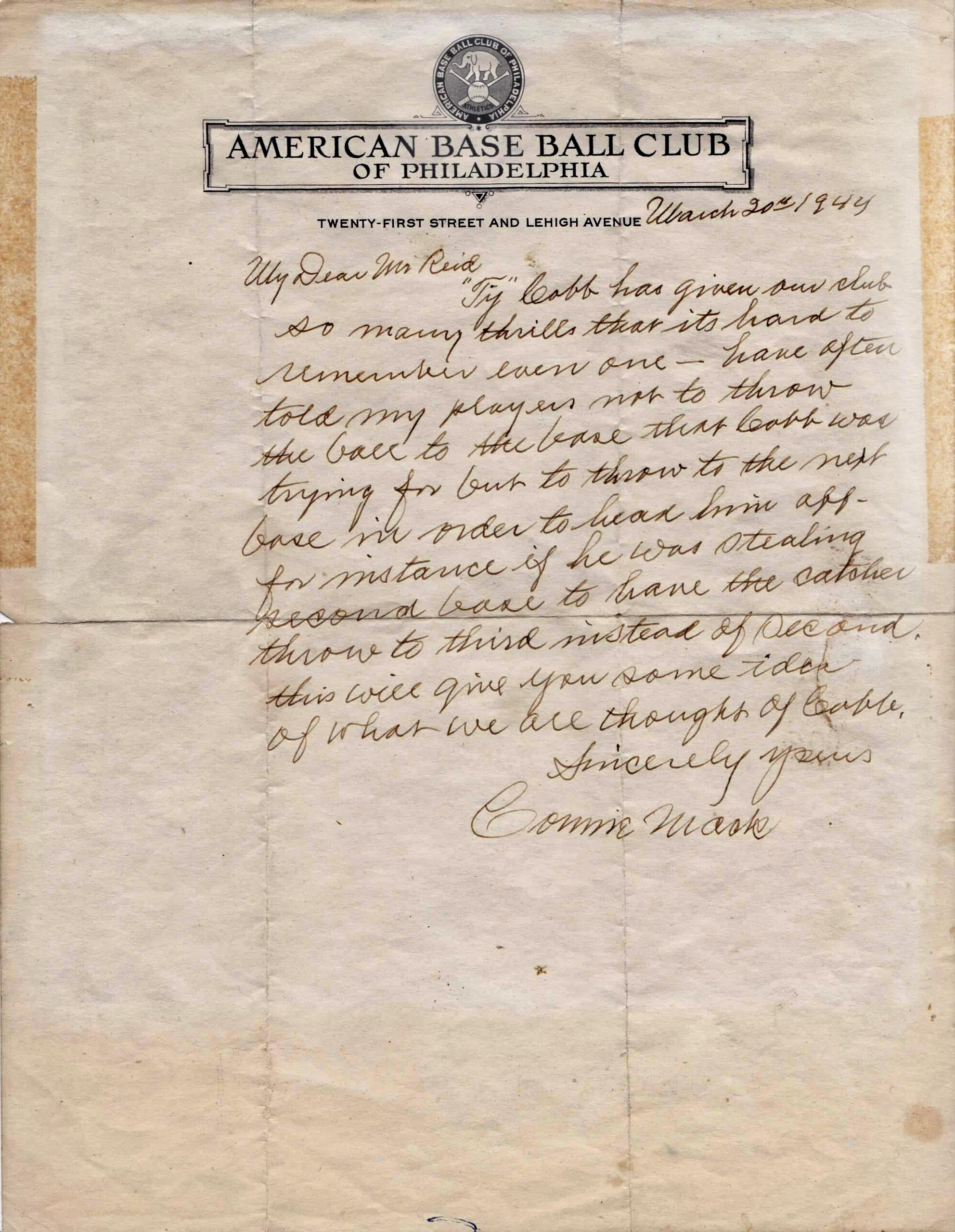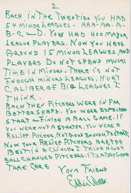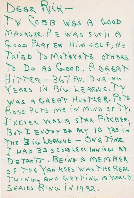 The above letter is from 11-year big league veteran Bill Werber. The first Duke University athlete to be All-American in both baseball and basketball, Werber led the American League in stolen bases three times.