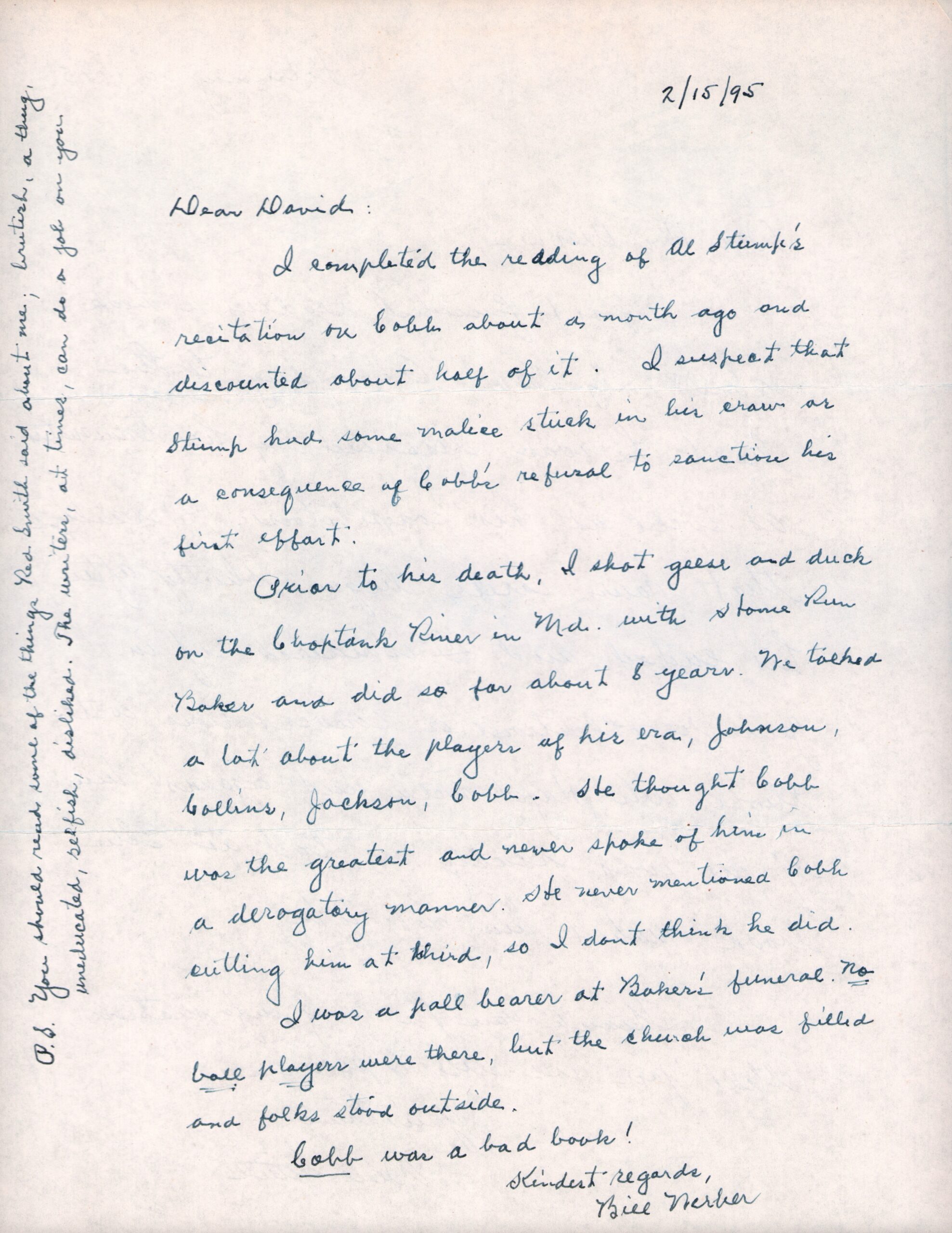 “Prior to his death, I shot duck and geese…with Home Run Baker and did so for about 8 years…He thought Cobb was the greatest and never spoke of him in a derogatory manner.