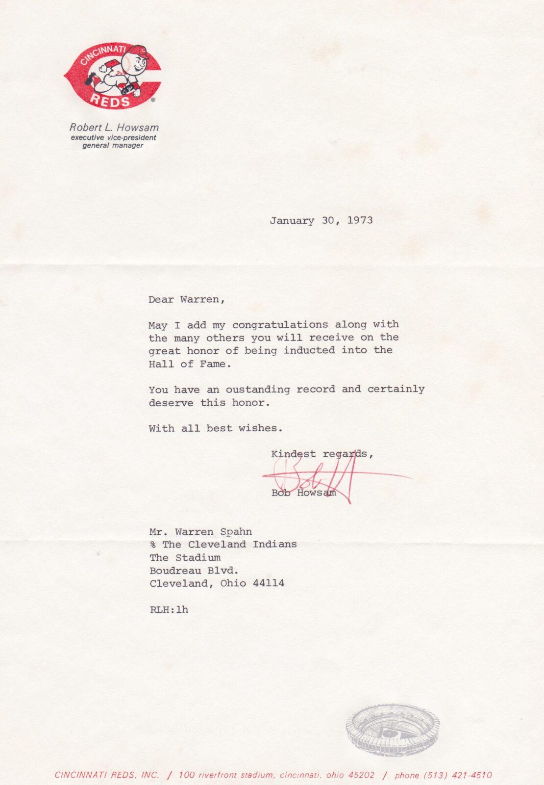 Bob Howsam writes to newly-elected Hall of Fame pitcher Warren Spahn on January 30, 1973. The executive vice president and general manager of the Reds writes, “Dear Warren, May I add my congratulations along the many others you will receive on the great honor of being inducted into the Hall of