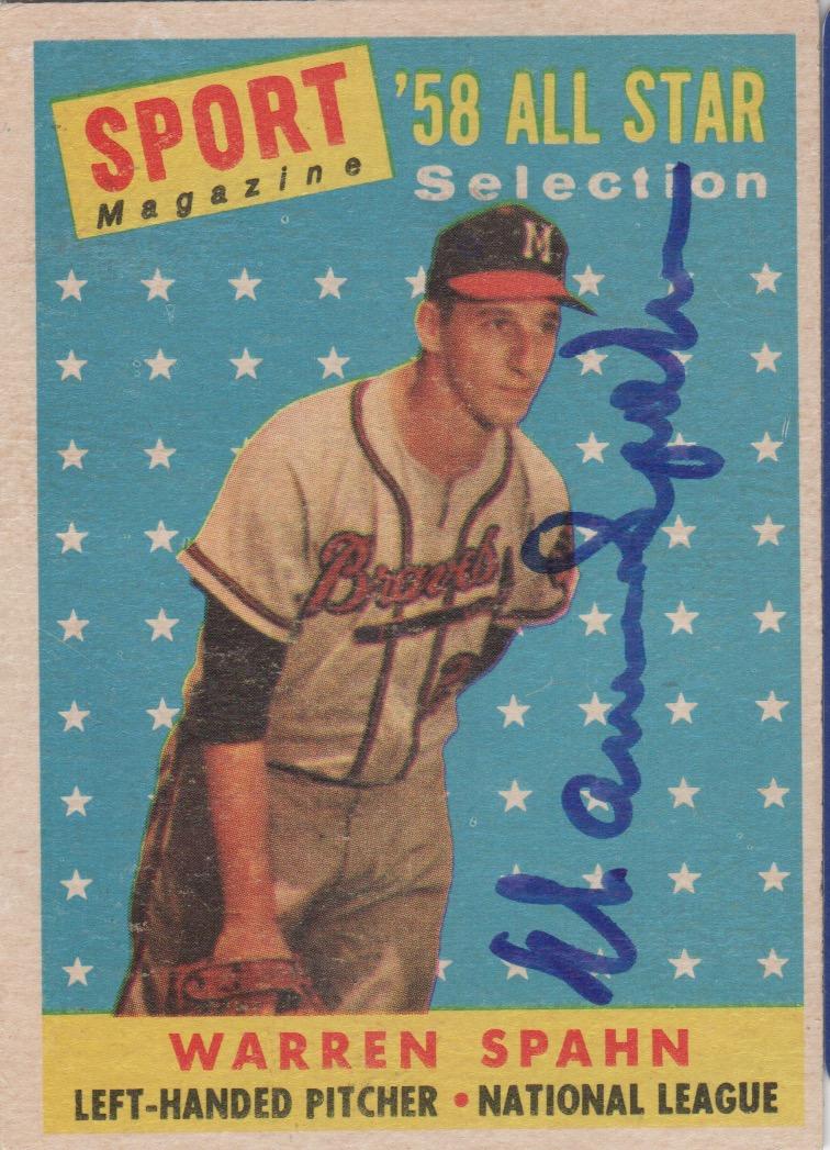 “Spahn shows no-hit form,” proclaims this 1962 Topps offering that’s autographed by the pitcher. Perhaps the greatest left-hander ever, Warren Spahn threw two no-hitters. The first came in 1960 at age 39. The second came the following year five days after his 40th birthday. Spahn w