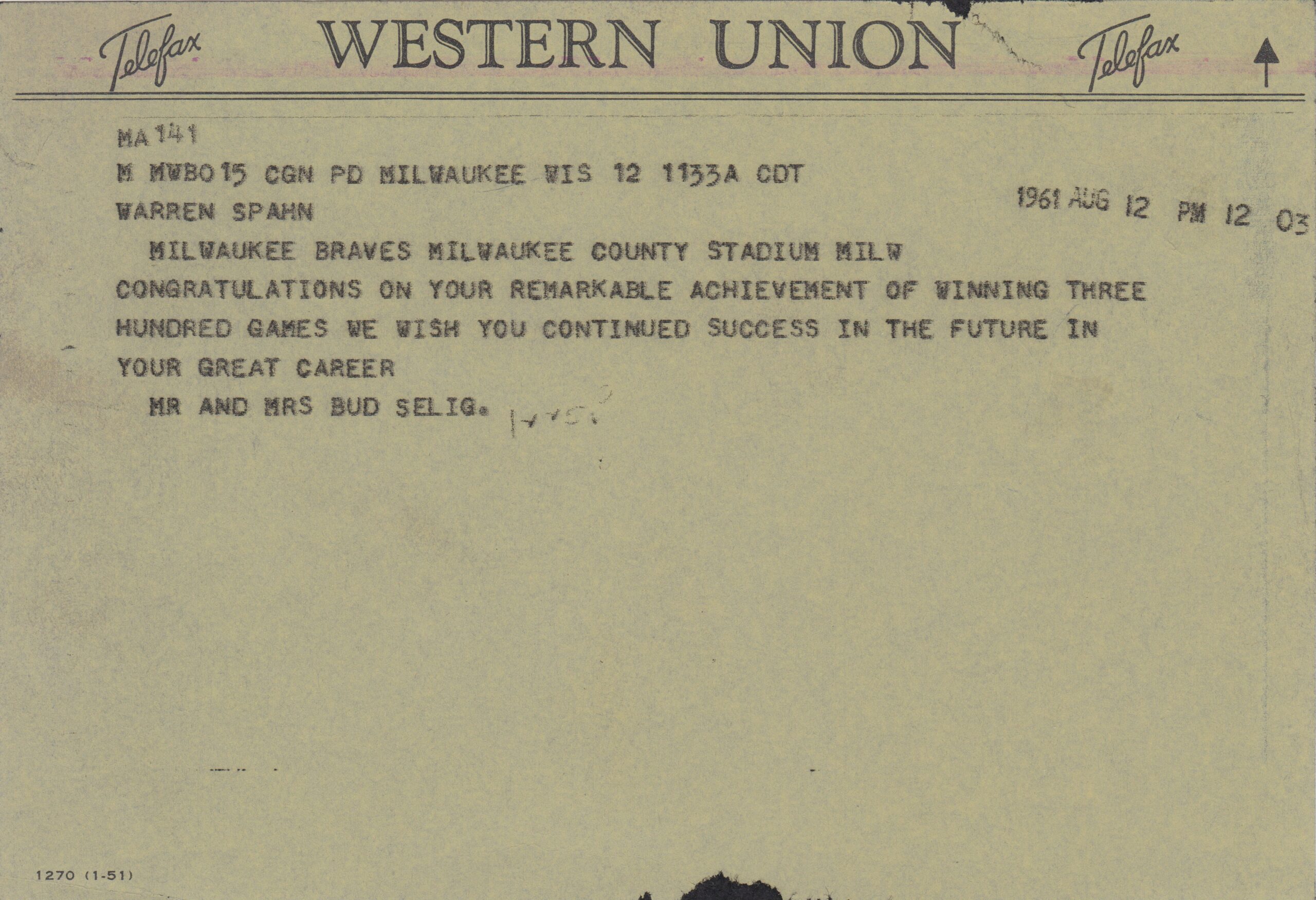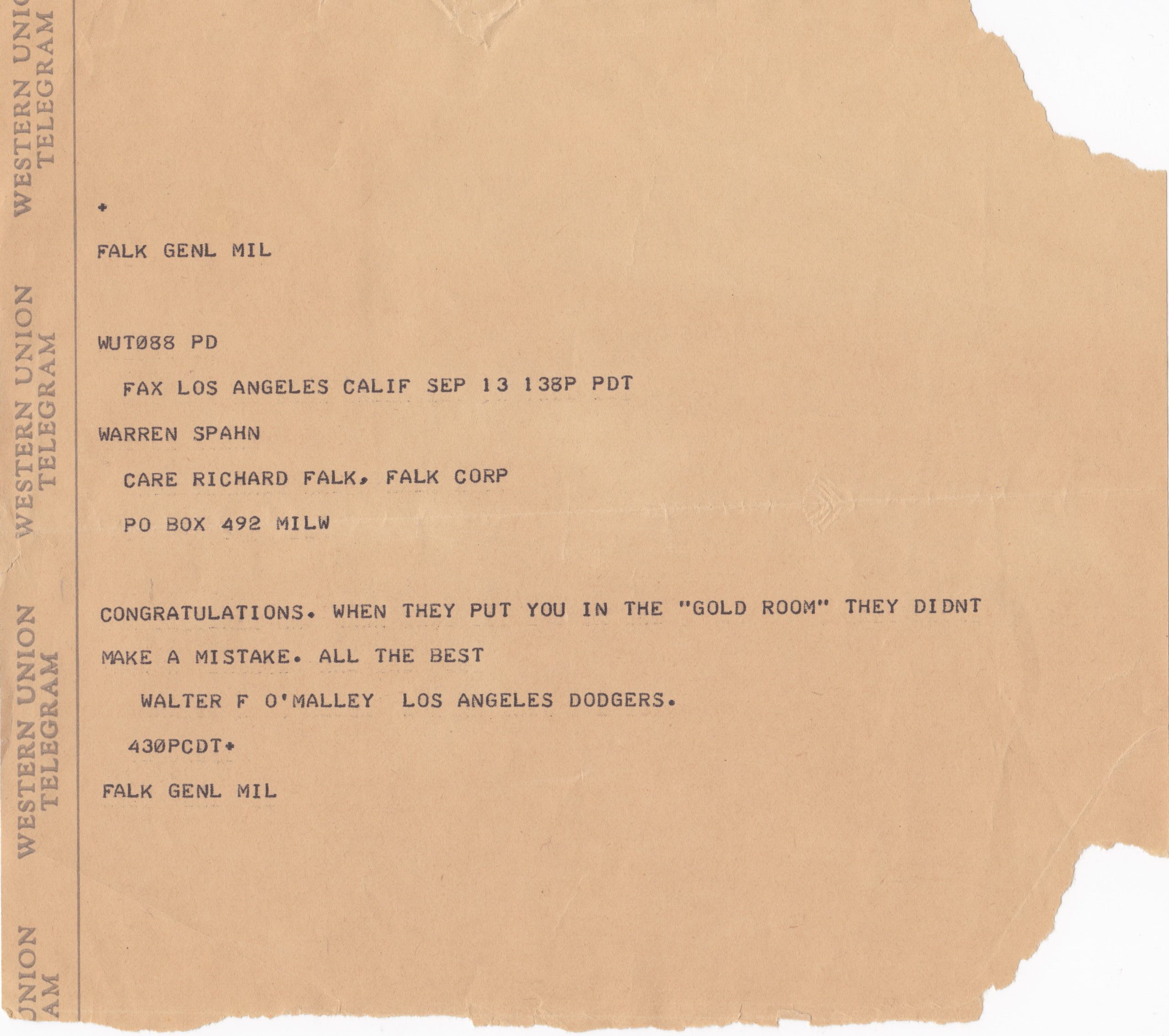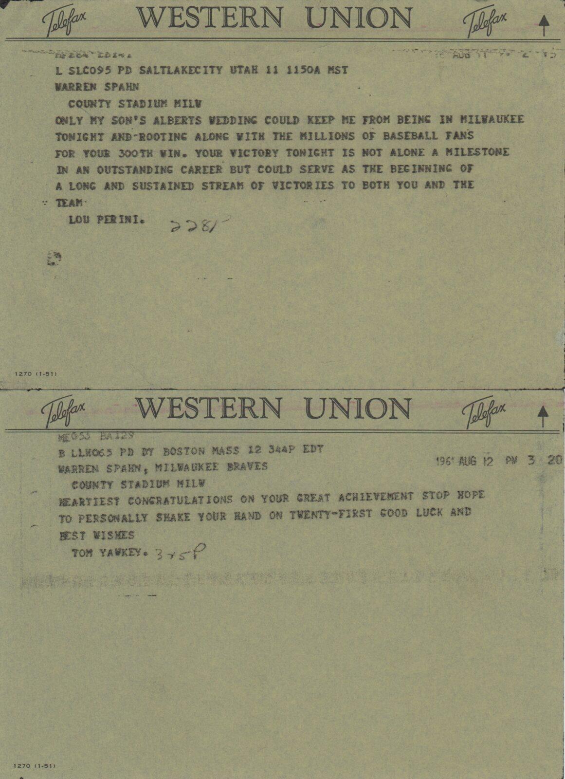 Among the other telegrams that Warren Spahn received is this example from San Francisco Giants owner Horace Stoneham. “Warmest congratulations on your 300th victory. It rates as one of the All-Time pitching records though we both know you won more than half of them from the Giants. All the ver