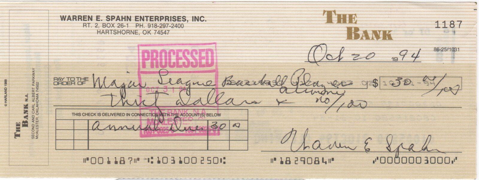 Active in the Major League Baseball Players Alumni Association, Spahn kept his membership up to date. Shown here is a personal check made out to the MLBPAA on October 20, 1994, 30 years after he played his last big league game. The check is for $30 and represents payment in full for the annual dues.