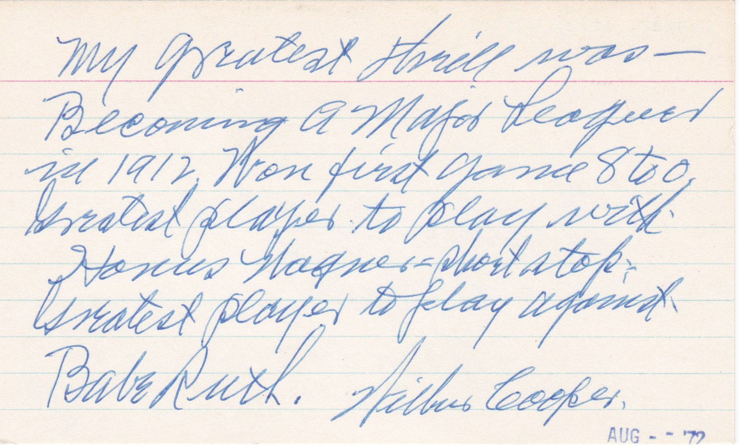 In the collection is an index card signed by the Pirates all-time WAR leader for pitchers. For more on Babe Adams, click here.
