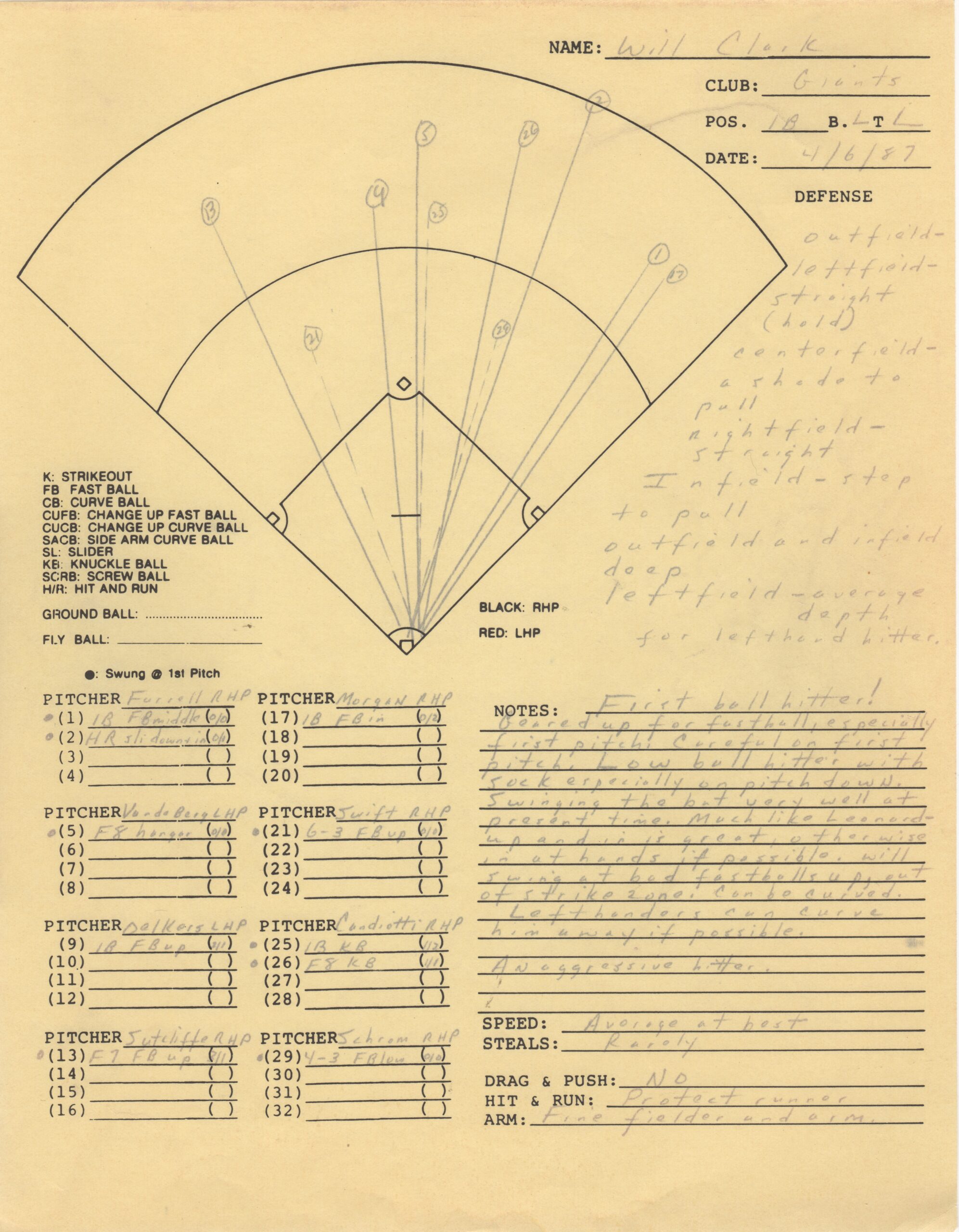 The lineup card shown here is from a June 28th contest between Clark’s Giants and Ryan’s Astros. In that Sunday afternoon game at Candlestick Park, Clark went 2-for-3 with an RBI single and a two-run bomb.