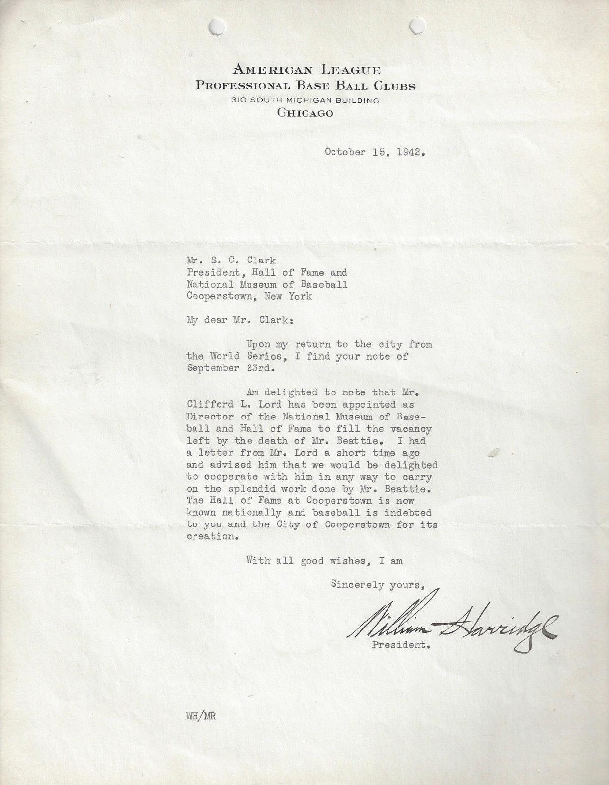 Will Harridge writes to Stephen Clark, founder of the Hall three years after its doors opened