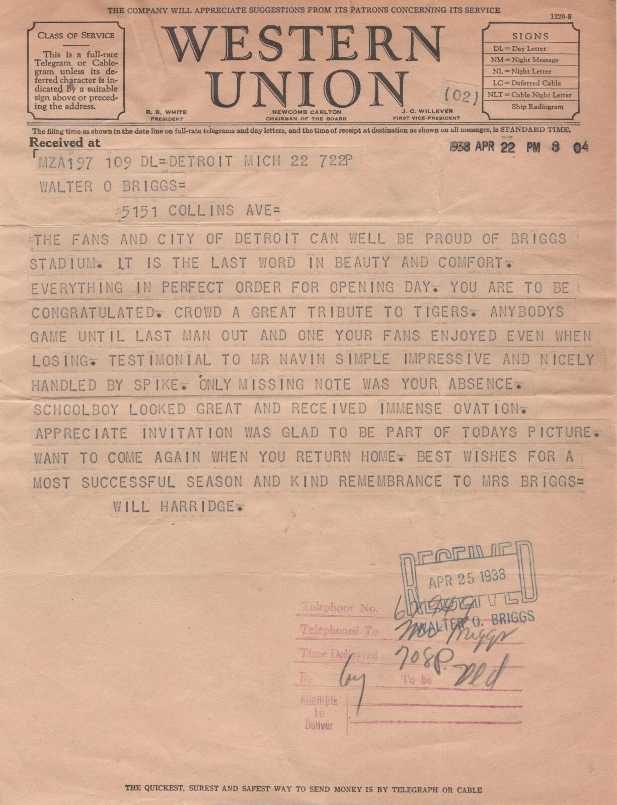 In the collection is this telegram from American League President William Harridge to Tigers owner Walter Briggs. The content surrounds the grand opening of the remodeled Briggs Stadium. Located at the corner of Michigan and Trumbull, the stadium was built by Tiger owner Frank Navin in 1912. With an