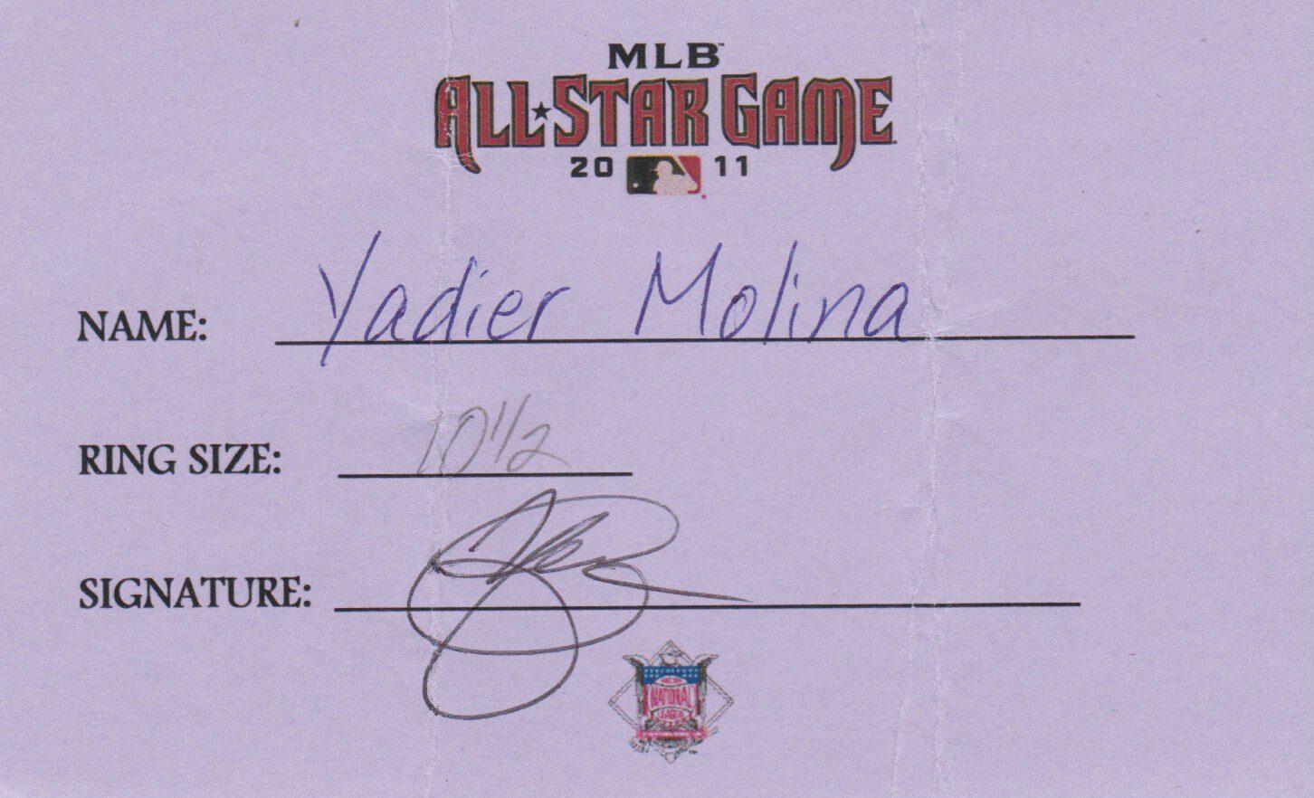 In the collection is the document Yadier Molina signed in 2011 to receive his ring. The catcher went 1-for-1 with a two-base hit in the contest. His NL squad bested the AL 5-1 behind a three-run shot by Prince Fielder, the game’s MVP.